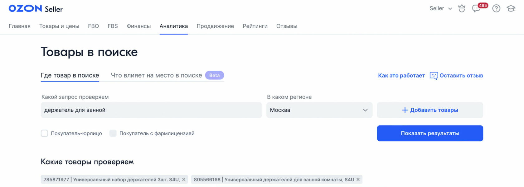 Мониторинг позиций лучше проводить регулярно, предпочтительно еженедельно. Следите за тем, по каким поисковым запросам карточка поднимается в топ, а по каким - нет, и в каких категориях она отображается. На Озоне для этого существует специальный раздел аналитических данных «Товары в поиске».
