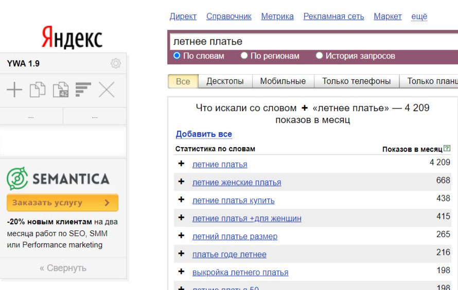 Для сбора семантики могут быть использованы встроенные инструменты площадок, а также внешние сервисы, такие как Яндекс Вордстат.